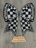 Checkered Black White Pink Sequins Bow Patch