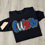 This Cuba sweatshirt features rich, high-quality embroidery in classic red, white, and blue, finished with a stunning spangle border that catches the light beautifully. The contrast against the black crewneck makes this design pop in the best way — sporty, festive, and full of pride.