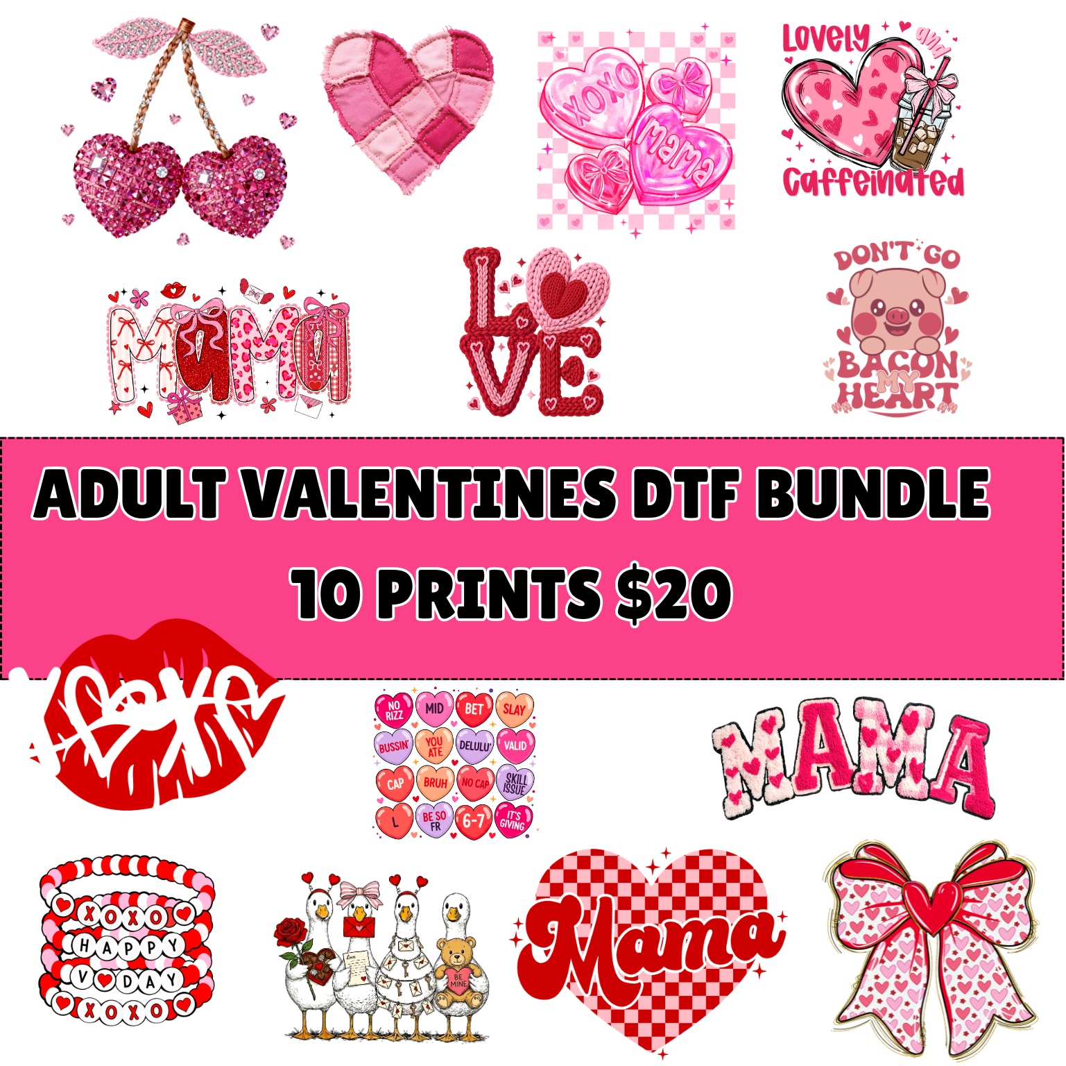You will get 10 Valentines themed Adult size DTF transfers
