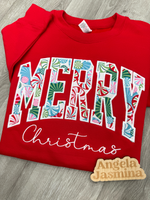 Bring holiday cheer in style with this cozy embroidered “MERRY Christmas” sweatshirt! The bold varsity-style “MERRY” letters are filled with festive peppermint and holiday prints, while “Christmas” is delicately stitched below in elegant script. Perfect for holiday parties, Christmas morning photos, or cozy nights by the fire.