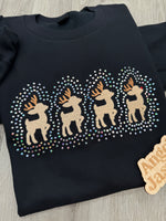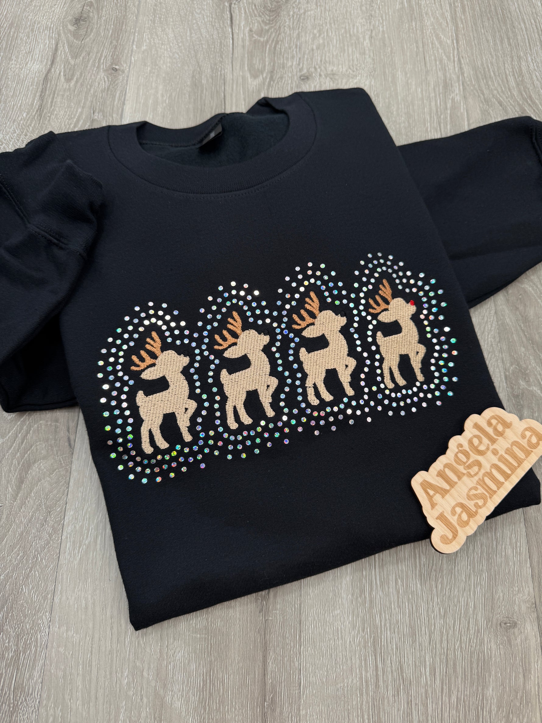 Get into the holiday spirit with this stunning Reindeer Bling Sweatshirt! ✨ This festive sweatshirt features four beautifully embroidered reindeer, each detailed with shimmering spangles that catch the light and sparkle from every angle. One of the reindeer even has a red nose for a touch of Rudolph charm, making it perfect for your next Christmas gathering or holiday photo shoot!