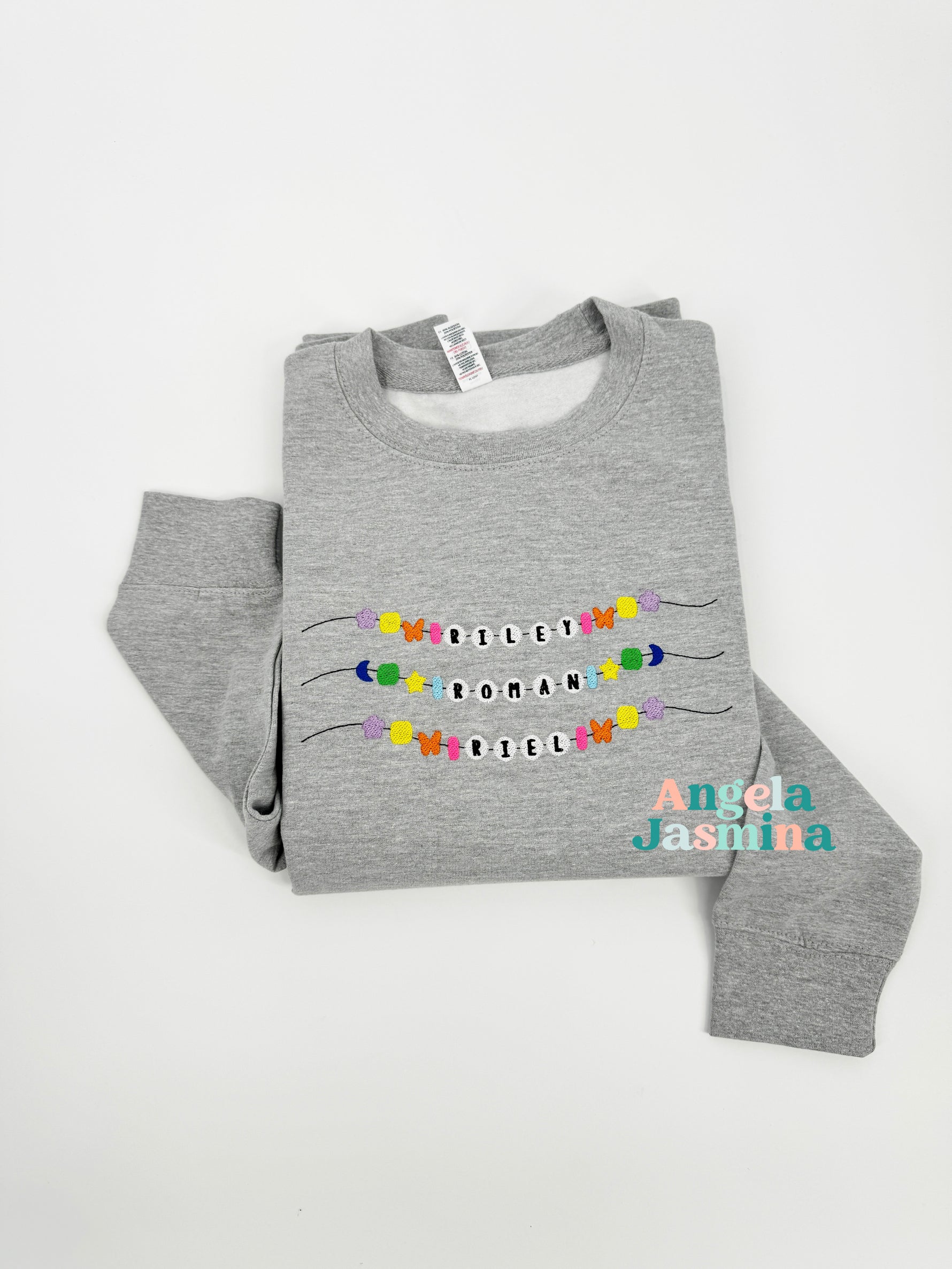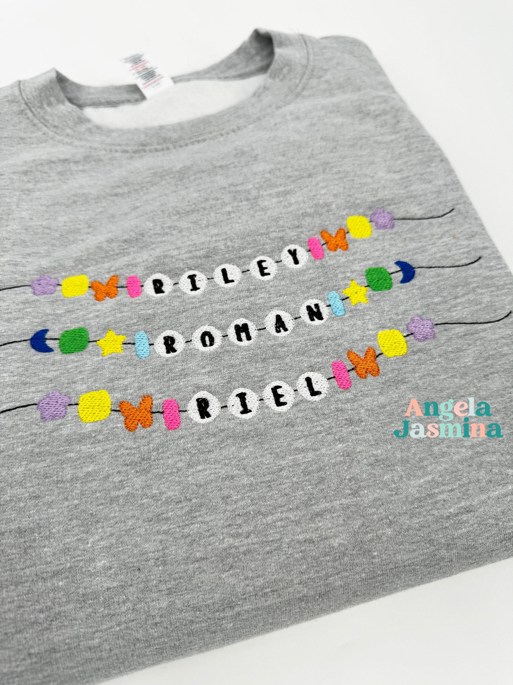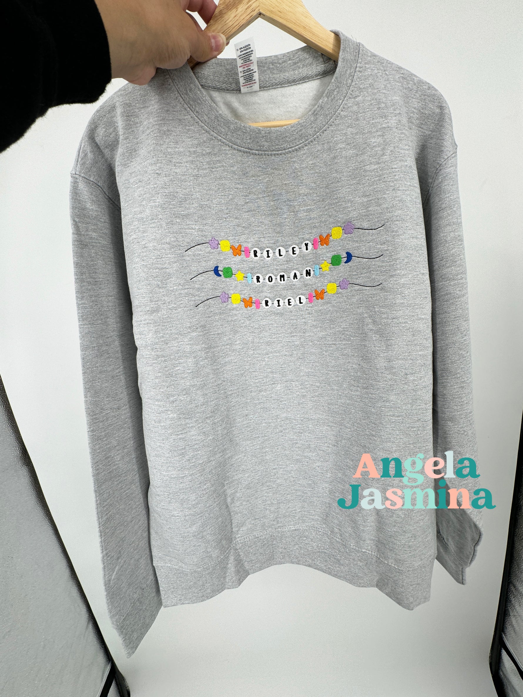 Introducing our personalized embroidered sweatshirt, a heartfelt tribute to motherhood and the cherished bonds with her little ones. Each child's name is intricately embroidered onto the sweatshirt in the style reminiscent of friendship bracelets, evoking nostalgia and warmth. This unique touch adds a personal and sentimental element, celebrating the love and connection between mother and child.