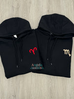 Stay cozy and show off your zodiac pride with our black embroidered hoodie. Each sweatshirt features the name of your zodiac symbol stitched in vibrant 3D puff foam in the color of your choice. Express your celestial style with this unique and comfortable piece.