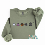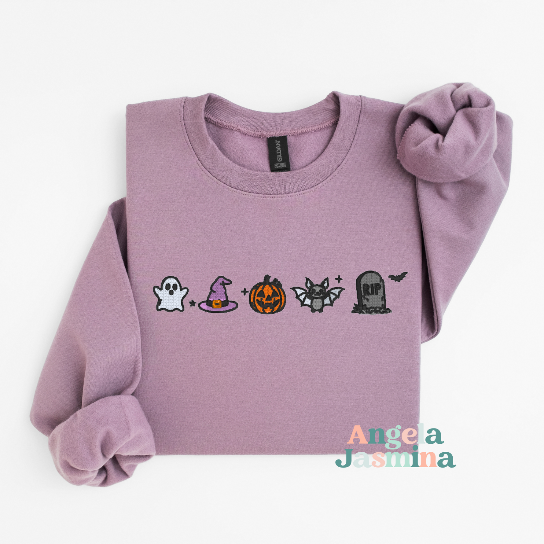 Get into the spooky spirit with this adorable embroidered Halloween sweatshirt! Featuring a row of cute icons โ€” a ghost, witch hat, pumpkin, bat, and tombstone โ€” this cozy top is perfect for all your fall festivities. Whether you're pumpkin picking, handing out candy, or just embracing the spooky season, this sweatshirt brings the perfect mix of cute and creepy.