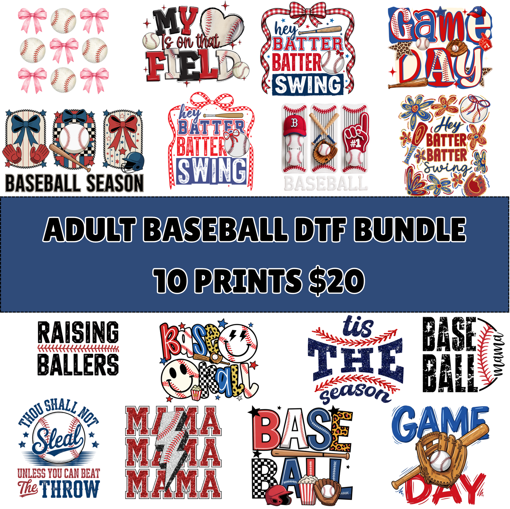 You will get 10 Baseball themed Adult size DTF transfers