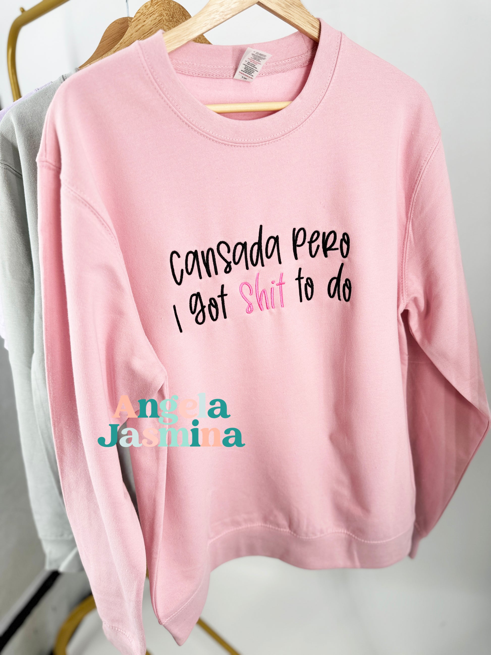Embrace your hustle while keeping it real with our embroidered sweatshirt: 'Cansada pero I got shit to do.' Perfect for those days when exhaustion kicks in but determination pushes you forward. Crafted with comfort and style in mind, this sweatshirt is your go-to for conquering the day with attitude. Stay motivated, stay focused, and let your sweatshirt do the talking. Because even when you're tired, you've still got things to accomplish