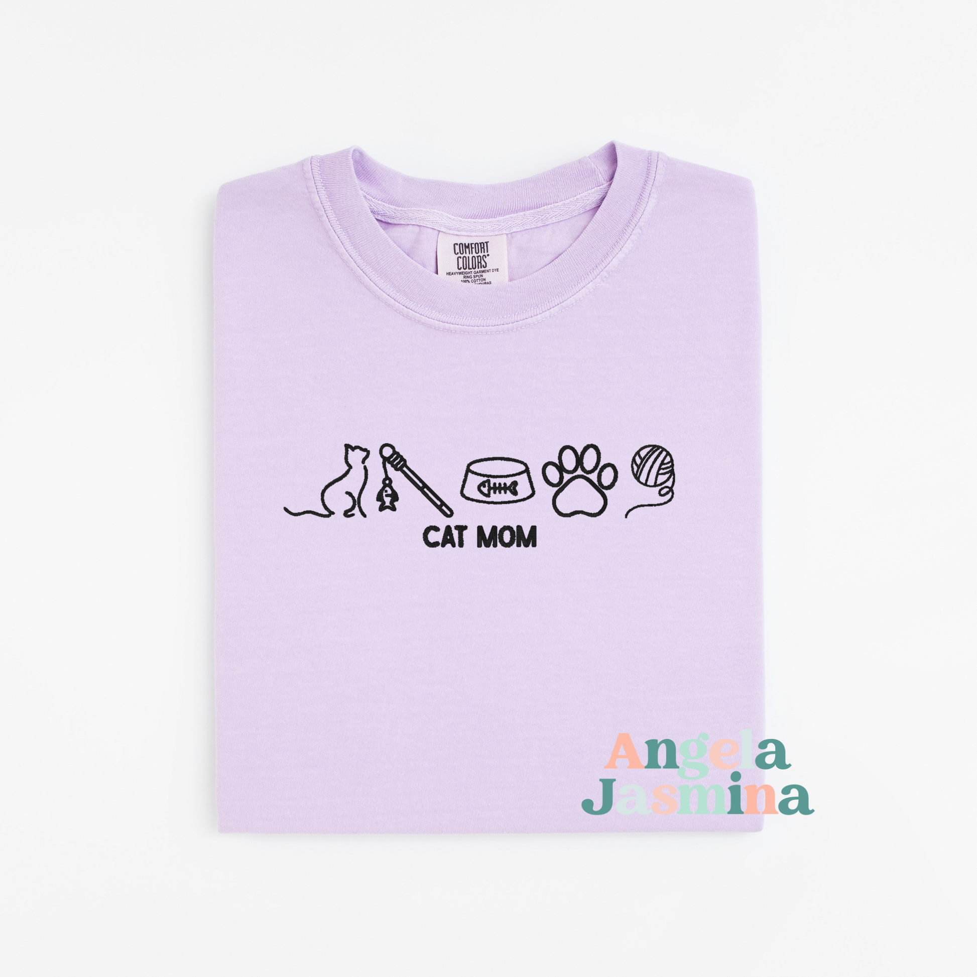 Designed for proud pet parents, this shirt features a minimalist embroidered row of cat essentials — a silhouette, toys, bowl, paw, and yarn ball — paired with bold "CAT MOM" text underneath. Professionally embroidered, this soft Comfort Colors shirt offers a comfy unisex fit that’s great for lounging, errands, or cuddling with your favorite fur baby.