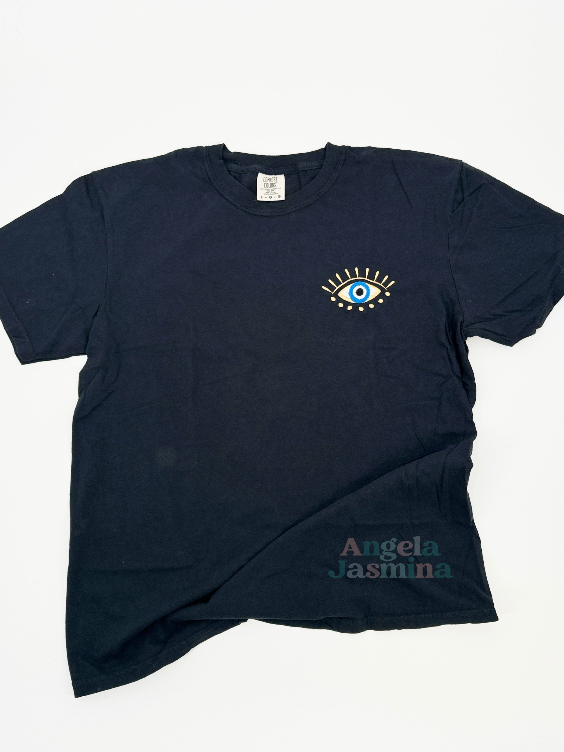 Evoke mystique and protection with our black embroidered left chest evil eye tee shirt. Crafted on a Comfort Colors brand tee, this piece blends comfort with intrigue. The iconic evil eye, intricately embroidered on the left chest, adds a touch of mystery and style to your wardrobe. Stand out with a symbol that transcends cultures and offers a unique charm to your everyday look.