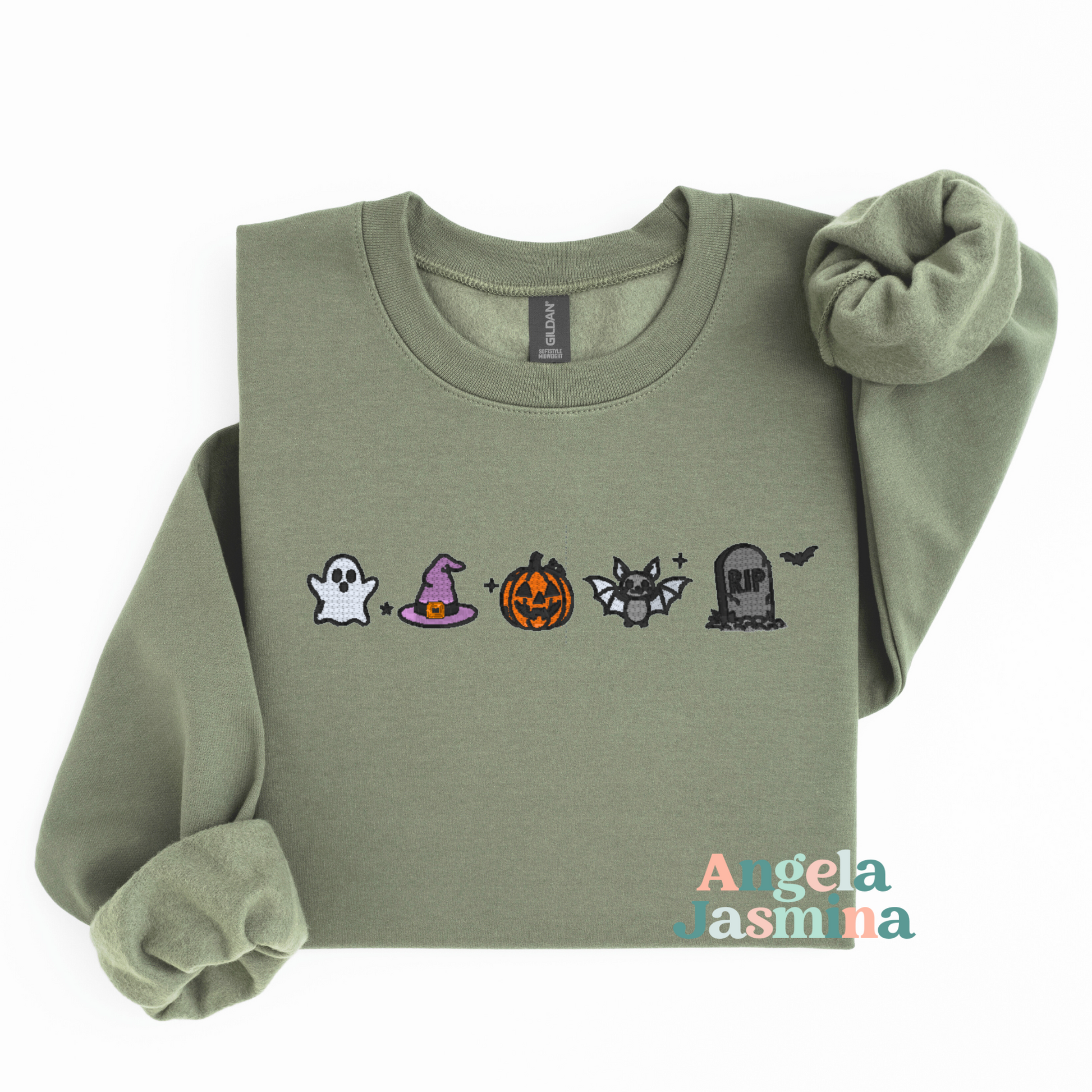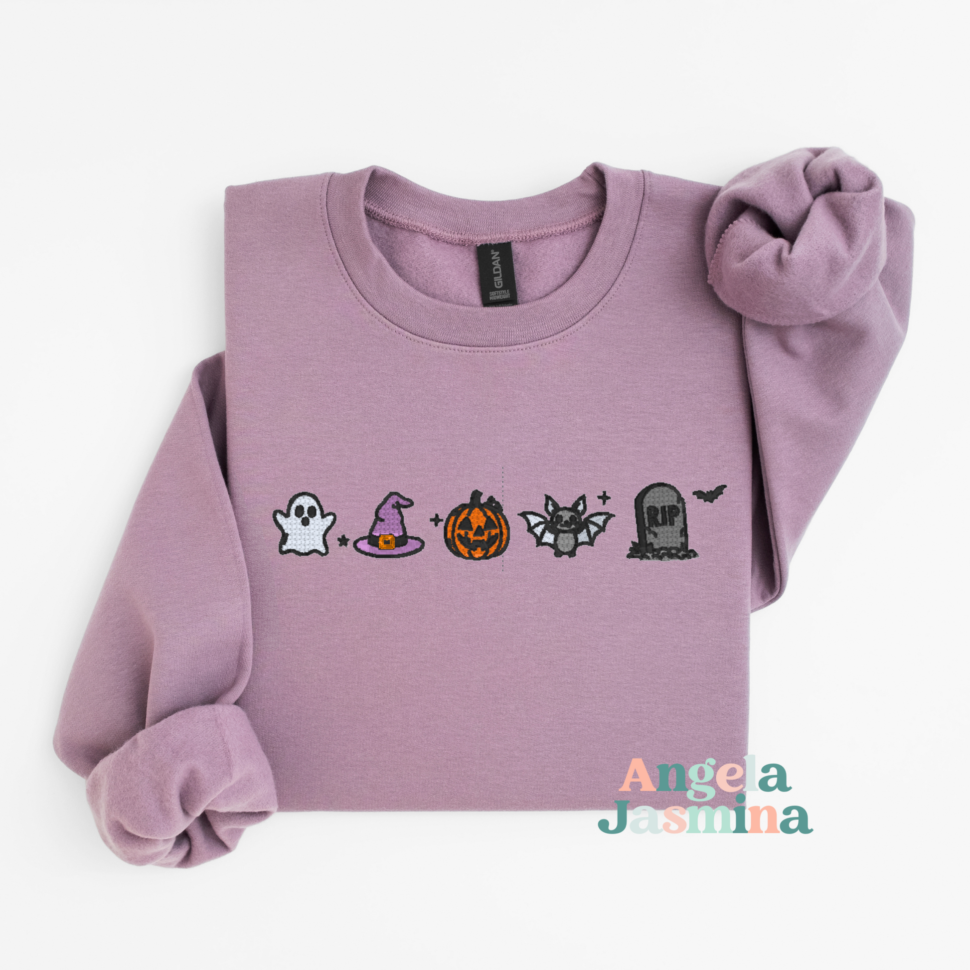 Get into the spooky spirit with this adorable embroidered Halloween sweatshirt! Featuring a row of cute icons — a ghost, witch hat, pumpkin, bat, and tombstone — this cozy top is perfect for all your fall festivities. Whether you're pumpkin picking, handing out candy, or just embracing the spooky season, this sweatshirt brings the perfect mix of cute and creepy.