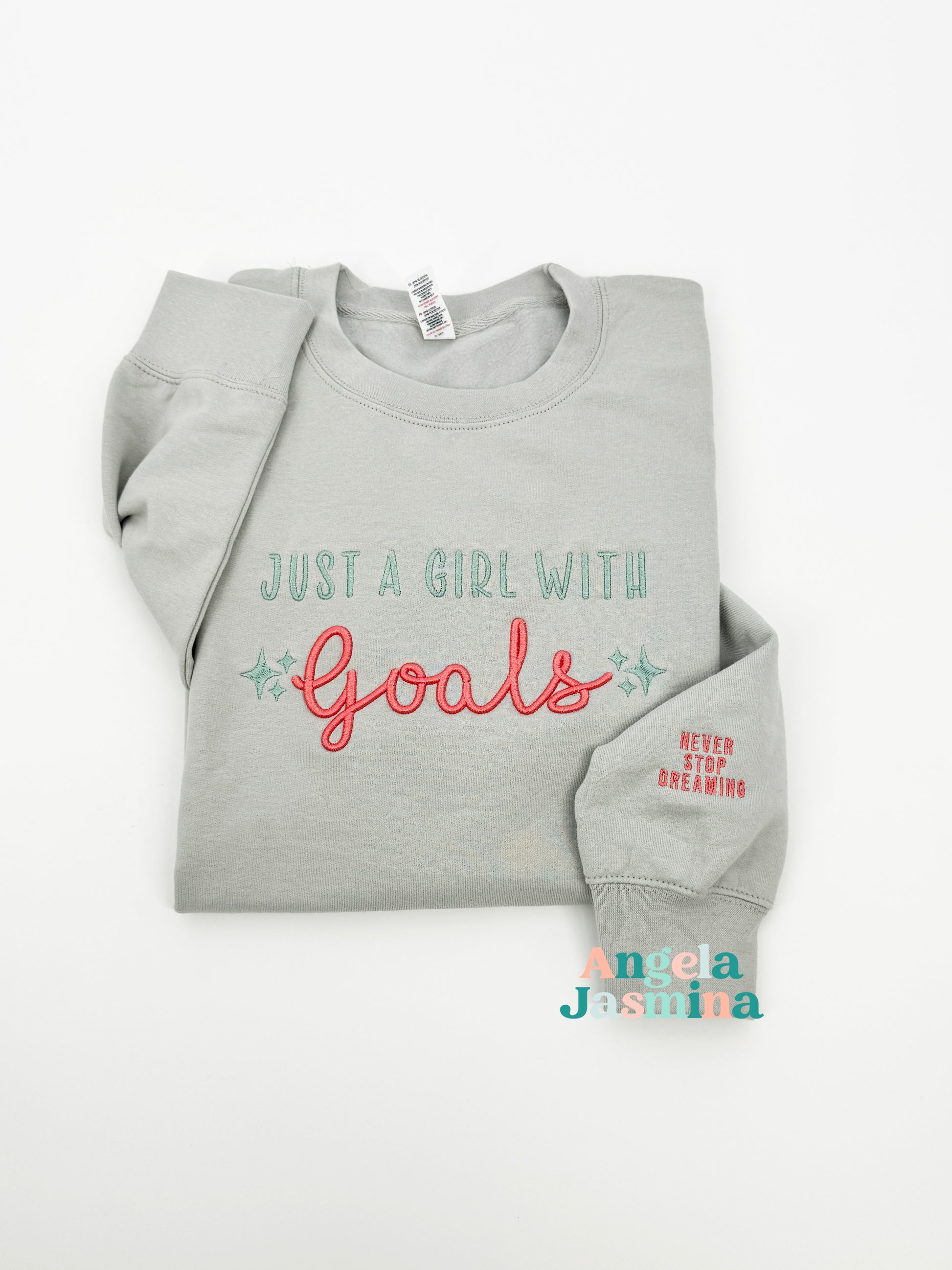 This embroidered sweatshirt features the empowering phrase "just a girl with goals," with the word "goals" highlighted in 3D puff foam for added texture and depth. The sleeve is adorned with the encouraging message "never stop dreaming," creating a stylish and motivational piece for anyone striving to achieve their dreams