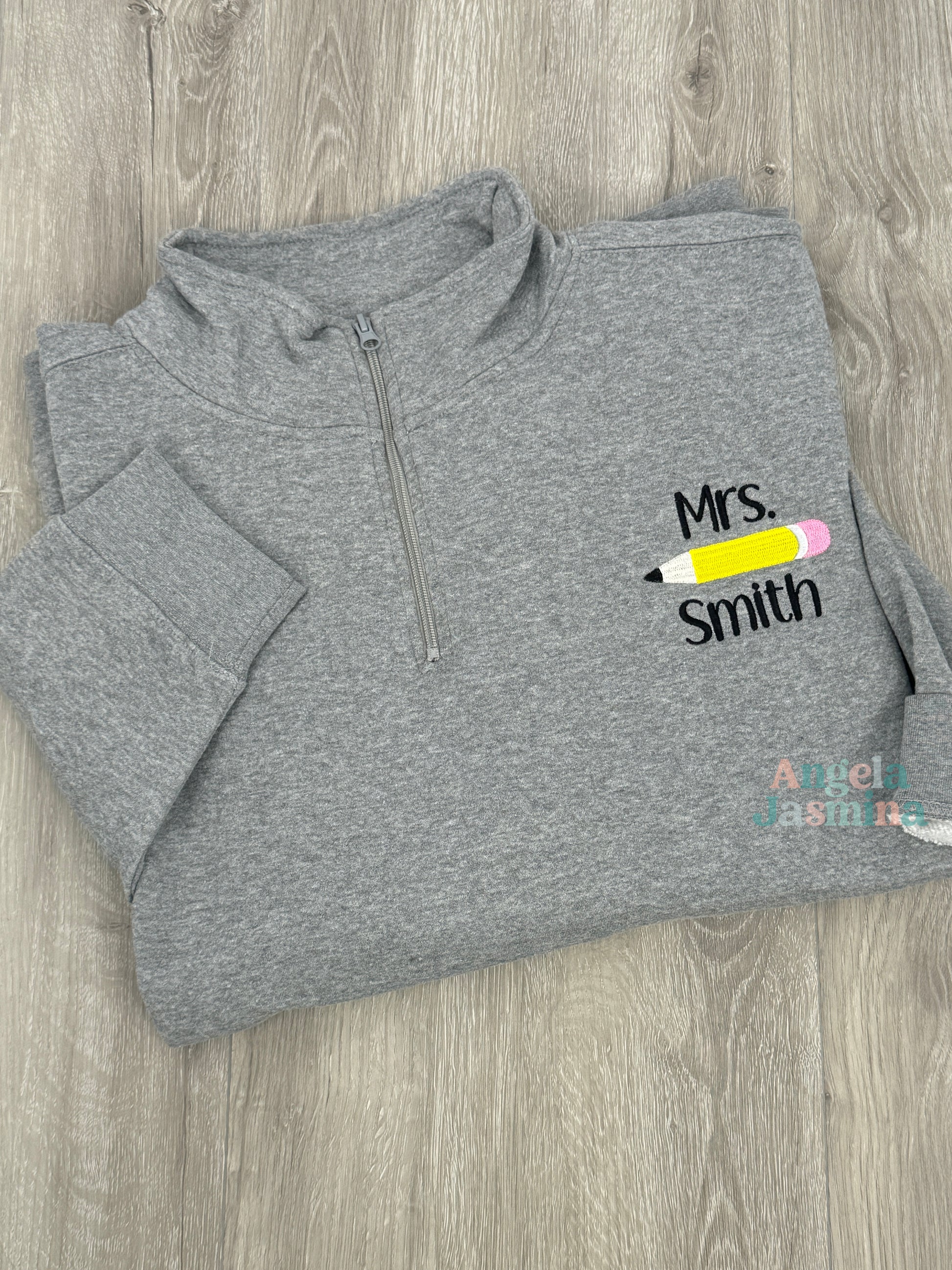 Celebrate the incredible teachers in your life with our cozy and stylish Personalized Teacher Quarter Zip Sweatshirt! This soft, comfortable sweatshirt features a charming pencil embroidery on the left chest, perfect for adding a touch of personalized flair. Customize it with the teacher's name, whether it's Ms., Mrs., or any other title, to make it truly unique.